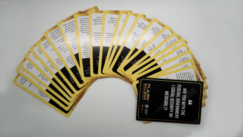 Gotta get the cards! Flash2Close Medicare Sales Flashcards train you how to quickly move the conversation forward using expert, proven responses to any objection.
